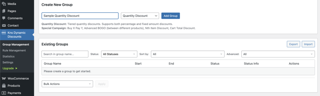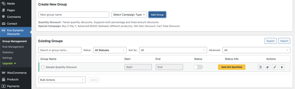 In your WordPress admin, go to Kns Dynamic Discounts → Group Management